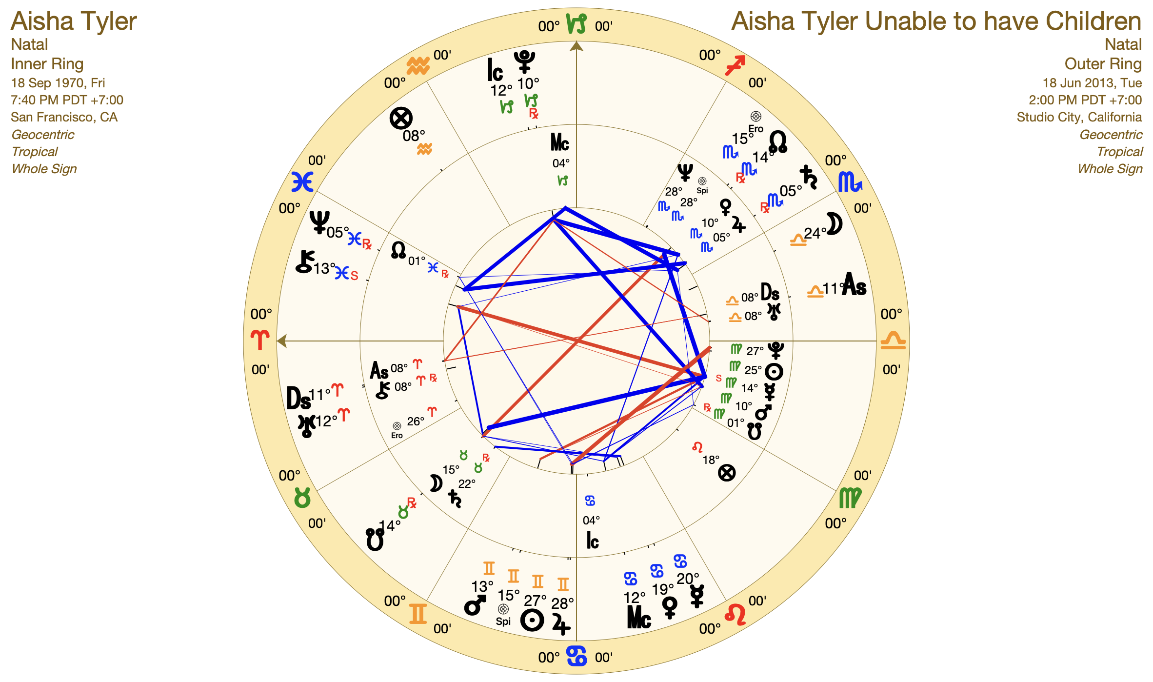 Aisha Tyler is an American actress and talk show host who has appeared in numerous TV shows and films. In her case, we are looking at someone who struggled with infertility. She was unable to have children but did not publicly disclose her exact diagnosis. However, we see the Chiron theme immediately in this incurable physical condition.