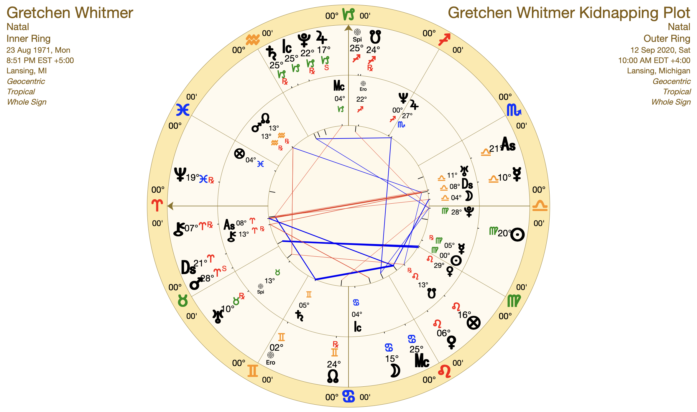 If you did not interpret Chiron but Gretchen came to you for a consultation, you would immediately see that the Saturn transit through the tenth house, along with the Mars, Jupiter, and Pluto conjunctions, would mark an extremely difficult time. Pluto is often associated with Hades, who in mythology kidnapped Persephone. In astrology, Pluto is also linked with hidden plots, kidnappings, rape, and power struggles. Saturn represents strict measures, which she likely had to enforce in her professional role. The tenth house governs one’s career; Saturn shows the capacity to create strict rules, and Pluto takes everything to an extreme. Gretchen became known for imposing some of the strictest lockdowns and restrictions in the United States.