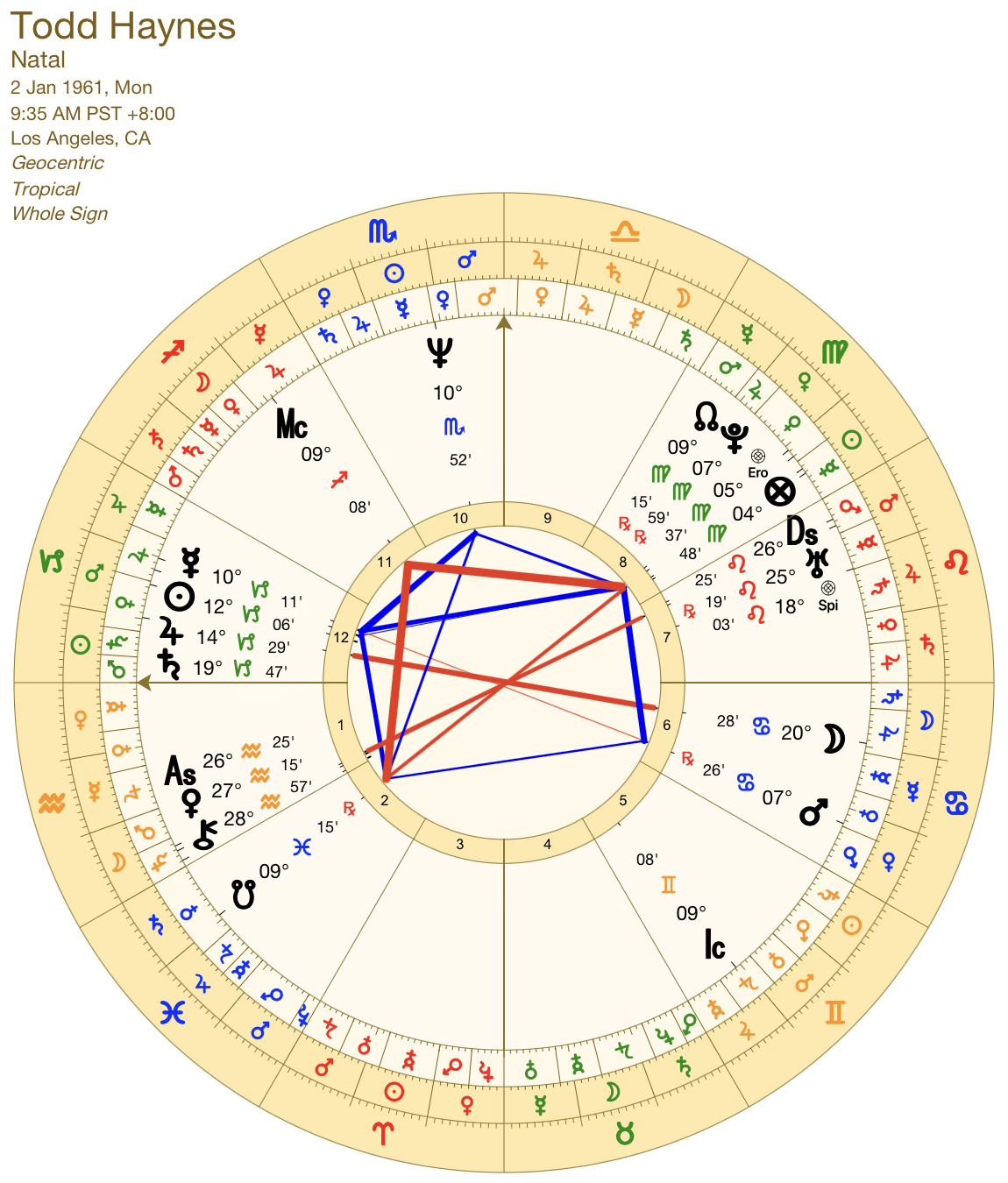 The valuable insight we gain from Chiron in his chart is the native’s inclination to be scapegoated. Chiron in the first house often feels like carrying a target on one’s back, creating many opportunities to be blamed. In Todd’s case, he received a small grant of $25,000 from the National Endowment for the Arts to make his film Poison. Reports indicate this represented about 10% or less of the total production budget. In spite of this, because the film depicted a queer relationship at a sensitive time in history, Todd and his work were attacked by Reverend Donald Wildmon and Senator Jesse Helms, who claimed the film misused public funds.
