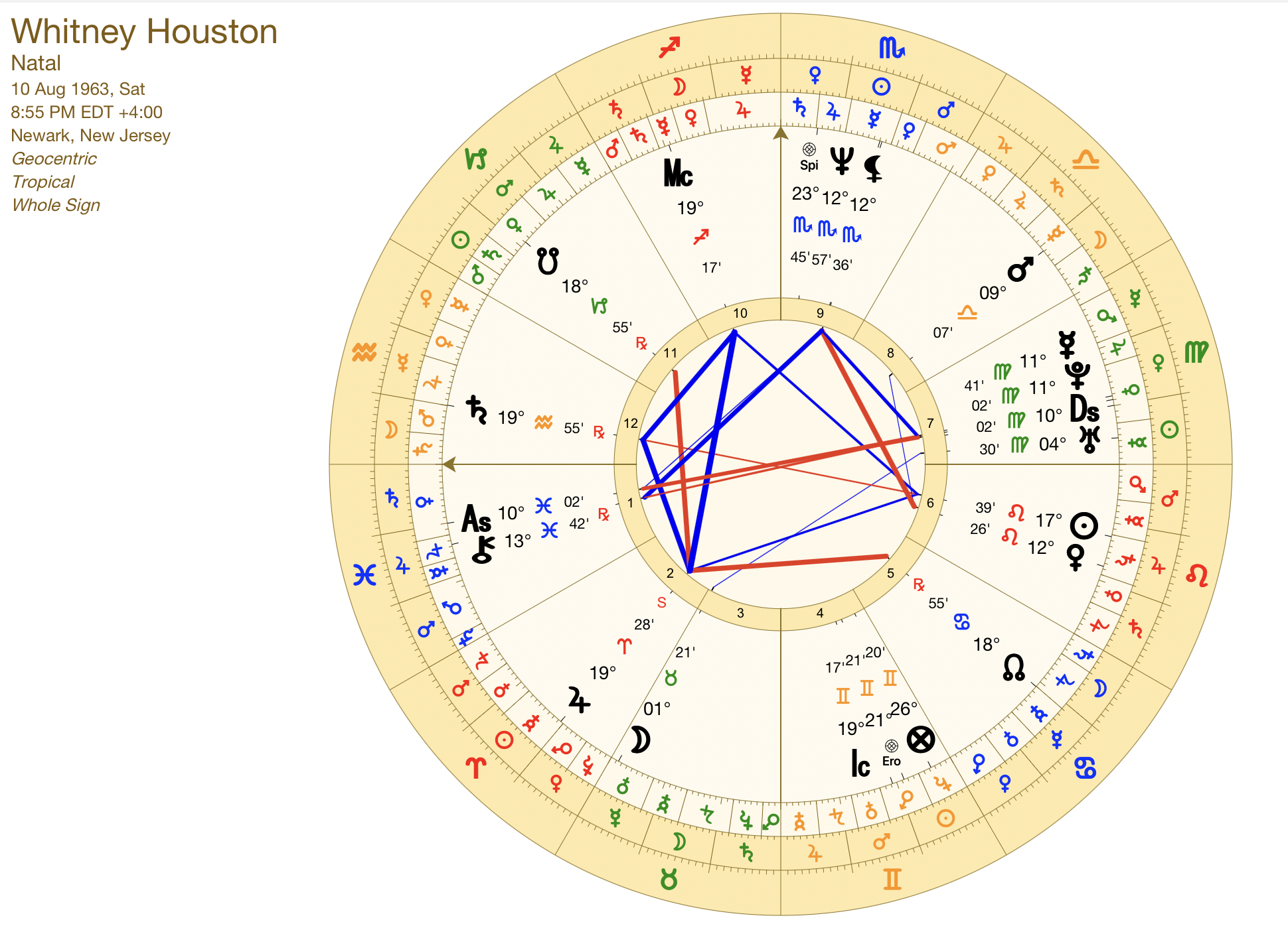 Whitney had Chiron in Pisces, very close to the Ascendant. This time we have a water sign — and a particularly complex one. All water signs relate in some way to emotional intelligence and emotional well-being. It is apparent from Whitney’s chart that she carried a deep emotional wound around her sense of self, personality, and identity.