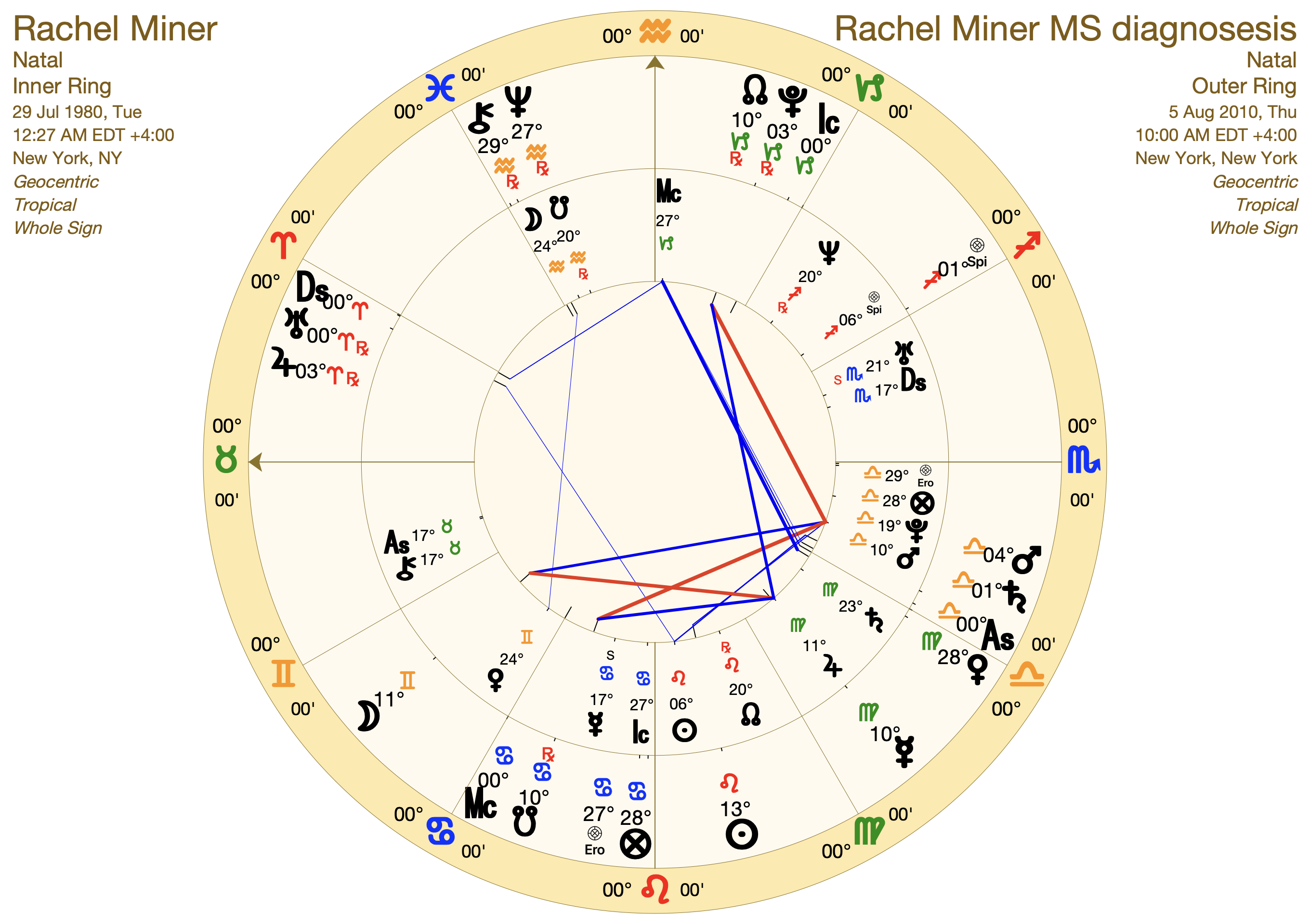 She is the first person I came across whose life story and chart made the link to Chiron very clear. According to Rachel, she was diagnosed with multiple sclerosis about a week after her 30th birthday, though she mentioned she had felt something was wrong about a year and a half before that.
